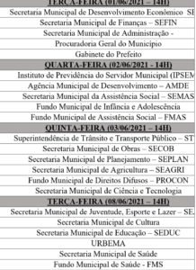 No dia 03/06: Superintendência de Trânsito e Transporte Público – STTP, Secretaria Municipal de Obras – Secob, Secretaria Municipal de Planejamento – Seplan, Secretaria Municipal de Agricultura – Seagri, Fundo Municipal de Direitos Difusos – Procon e Secretaria Municipal de Ciência e Tecnologia.